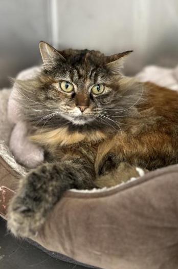 Autumn is a DLH, she is 2 years old and spayed. She's a Torty Mainecoon. Sweet with people, probably best if in an only cat home.